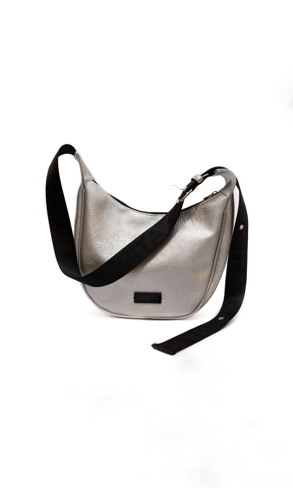 Cartera confeccionada en tela ecocuero PU plateado y forrada. Cuenta con bolsillo interno. Correa personalizada ÓRBITA regulable. Chapita de níquel ÓRBITA.